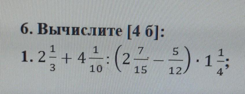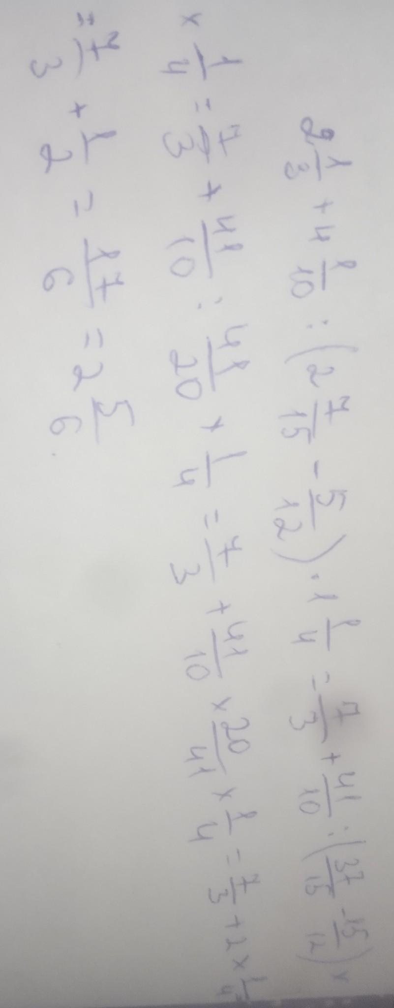 2 1/3+4 1/10:(2 7/15-5/12)*1 1/4=7/3+41/10:(35/15-15/12)*1/4=7/3+41/10:41/20*1/4=7/3+2*1/4=7/3+1/2=17/6=2 5/6.