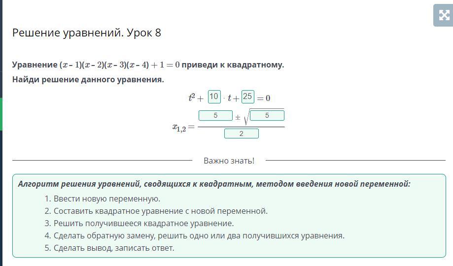 Уравнение (x – 1)(x – 2)(x – 3)(x – 4) + 1 = 0 приведи к квадратному.