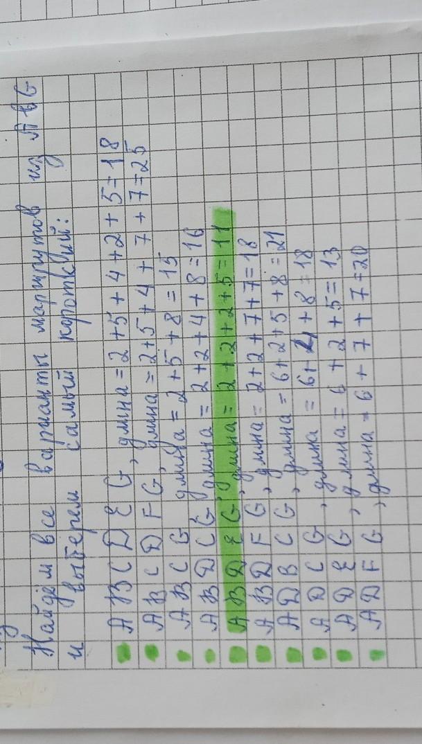 - воспользуемся приведенной в условии таблице и найдем все возможные варианты маршрутов из А в G (учитывая то, что в одну и ту же точку на одном пути не имеет никакого смысла).