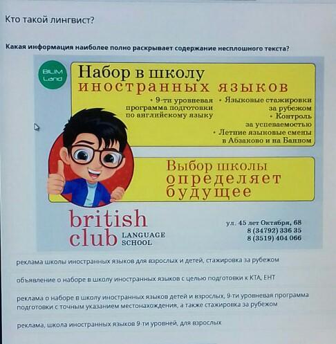 реклама о наборе в школу иностранных языков детей и взрослых, 9-ти уровневая программа подготовки с точным показанием местонахождения, а также стажировка за рубежом