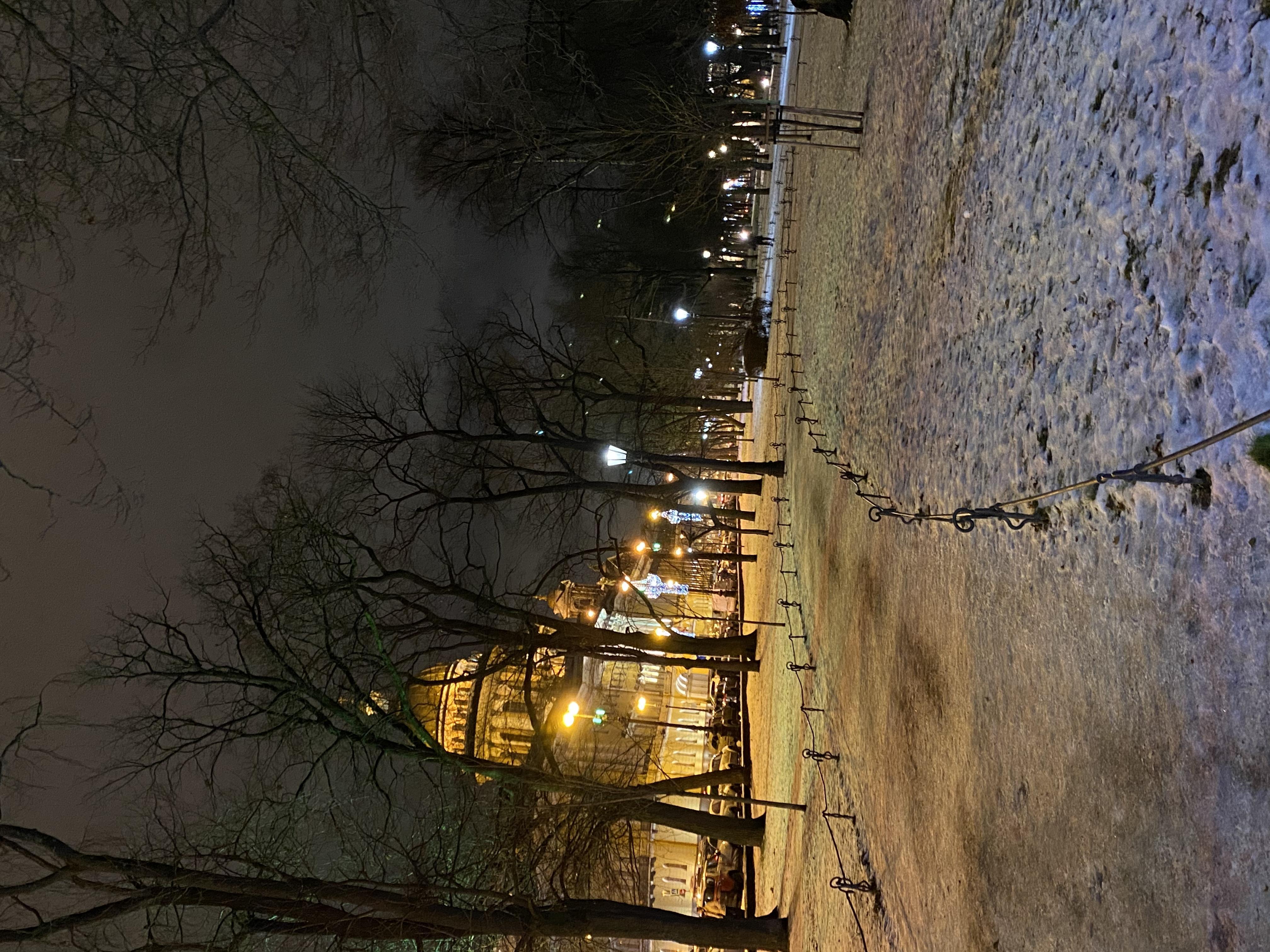 Вокруг меня много деревьев, фонарей. Впереди меня стоит красивый собор. Скользко. Я иду осторожно чтобы не упасть. Красивое время года - Зима.