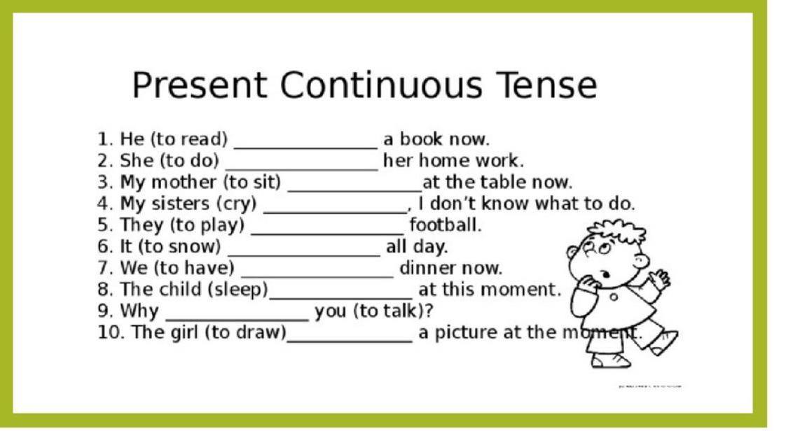 1. Is reading 2. is doing 3. is sitting 4. is crying 5.are playing 6. is snowing 7. are having 8. is sleeping 9. Why are you talking 10. is drawing