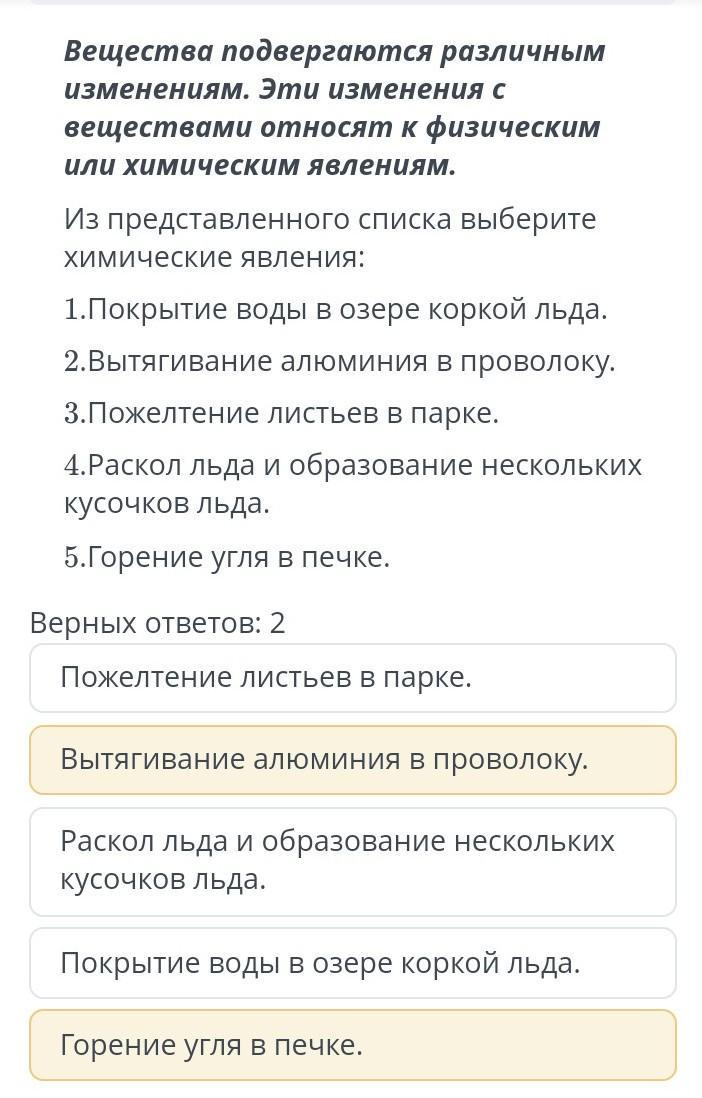 Объяснение: Химические явления горение, изменение цвета и т.д.