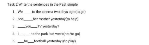 Раскройте скобки,чтобы получились предложения в форме past Simple we to the cinema two days ago (to go) 2. she her mother yesterday(to help) 3. you _tv yesterday? 4. the park last week(not/to go) he_football yesterday?(to play)