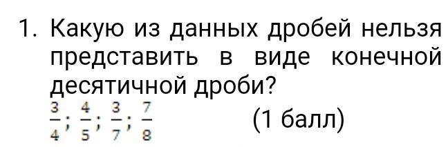 Какую из данных дробей нельзя представить в виде конечной десятичной дроби? ПОЖАЛУЙСТА ОТВЕТТЕ БЫСТРЕЕ У МЕНЯ СОЧ, ДАю 20 БАЛЛОВ