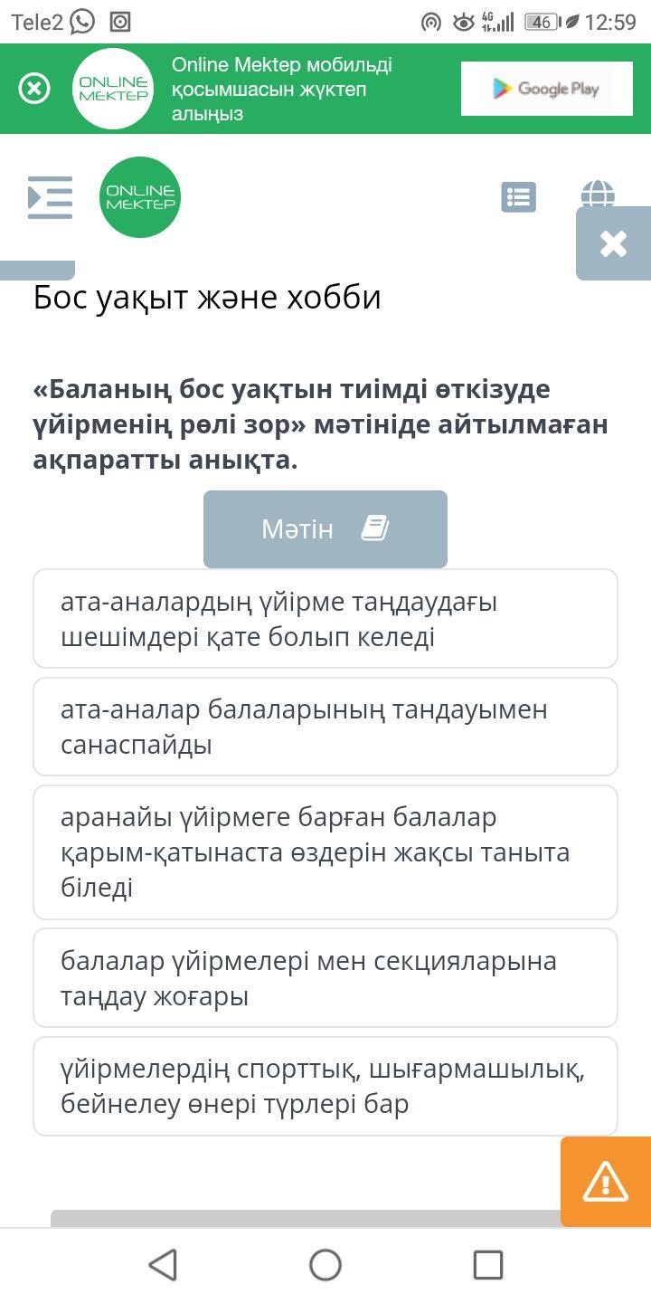 БАЛАНЫҢ БОС УАҚЫТЫН ТИІМДІ ӨТКІЗУДЕ ҮЙІРМЕНІҢ РӨЛІ ЗОР МӘТІНІНДЕ АЙТЫЛМАҒАН АҚПАРАТТЫ АНЫҚТА!