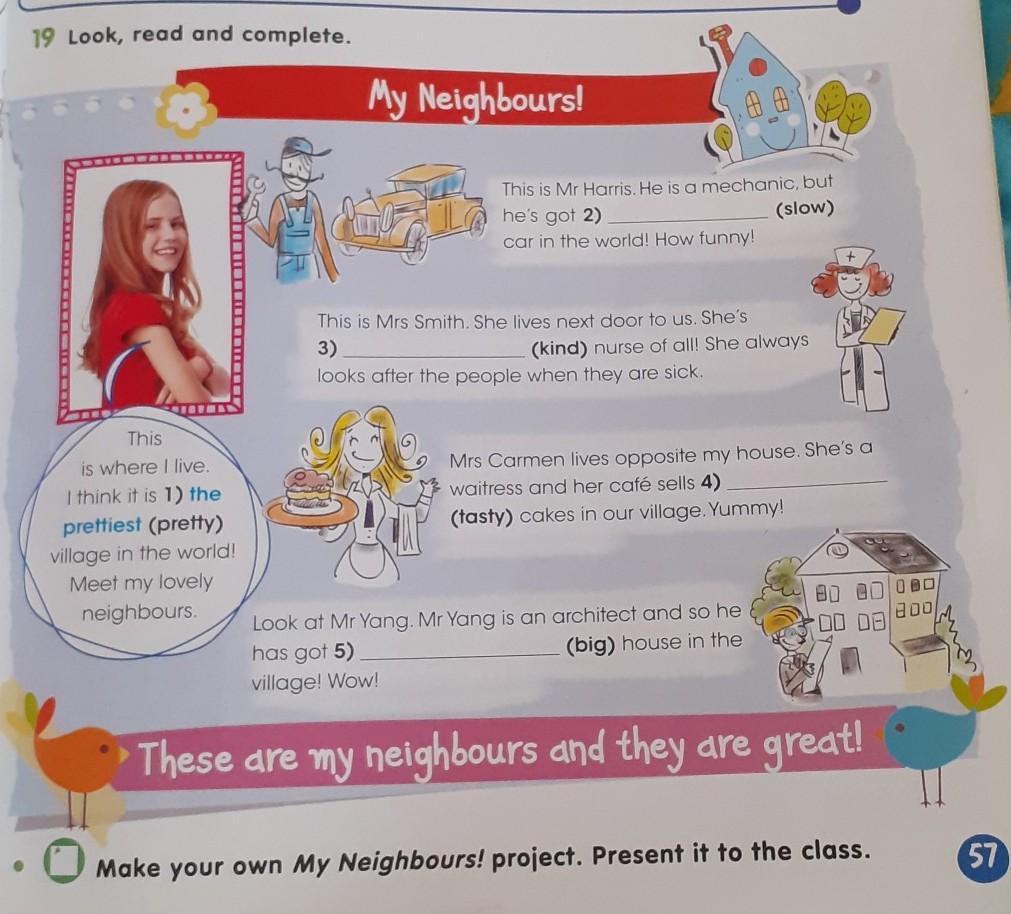 This is Mrs Smith. She lives next door to us. She's 3) the kindest nurse of all! She always looks after the people when they are sick.