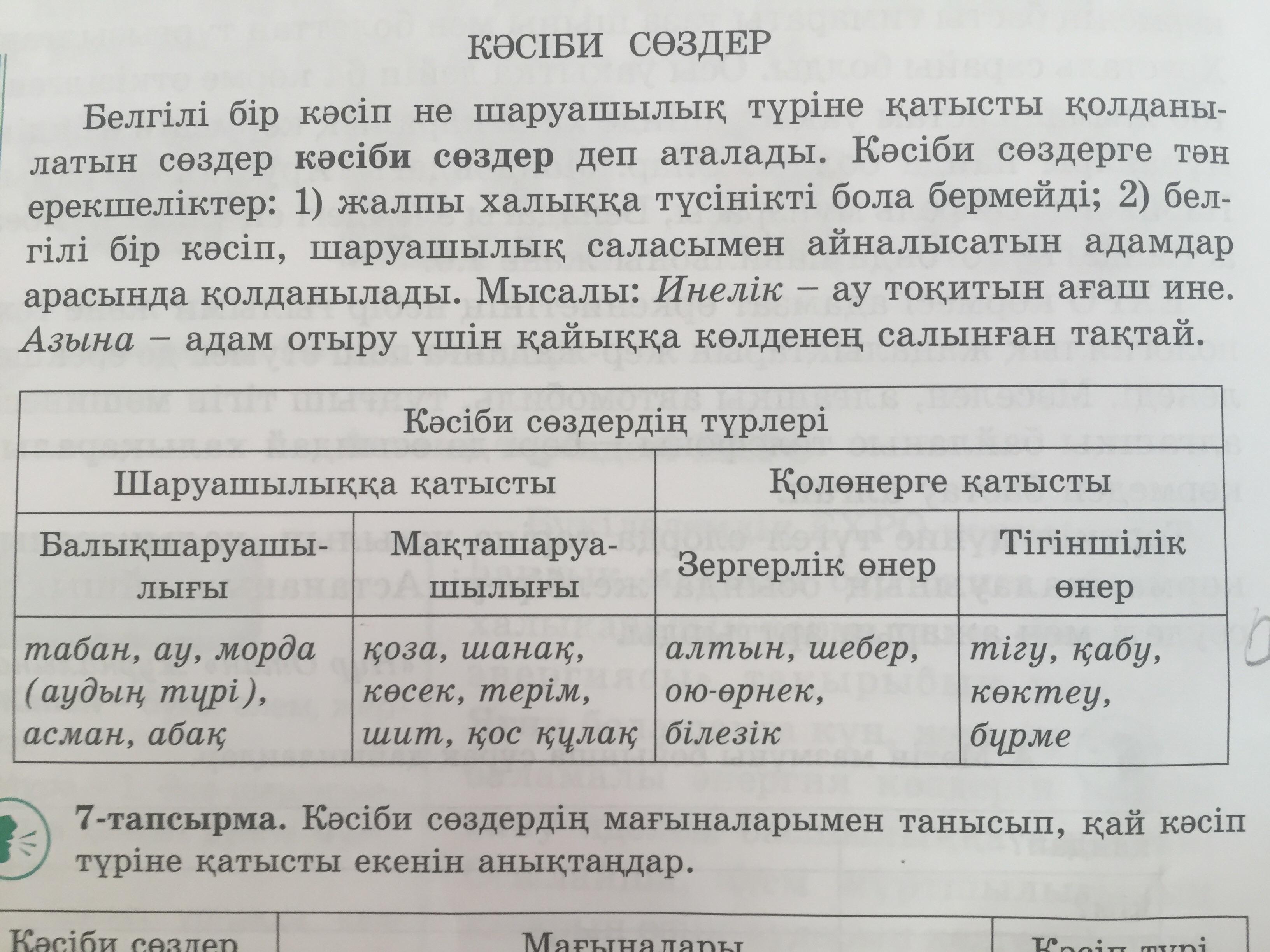 Ответ:кәсіби сөздер-жұрттың барине тусиникти бола бермейтин,белгілі бир касиппен шугылданатын адамдар