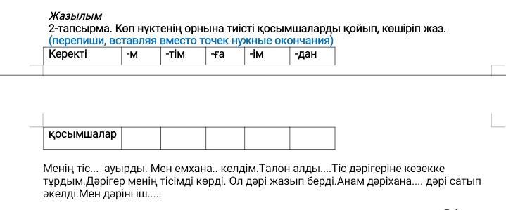 Ответ: Менің тісім ауырды. Мен емханаға келдім. Талон алдым . Тіс дәрігеріне кезекке тұрдым . Дәрігер менің тісімді көрді. Ол дәрі жазып берді. Анам дәріханадан дәрі сатып әкелді. Мен дәріні іштім.