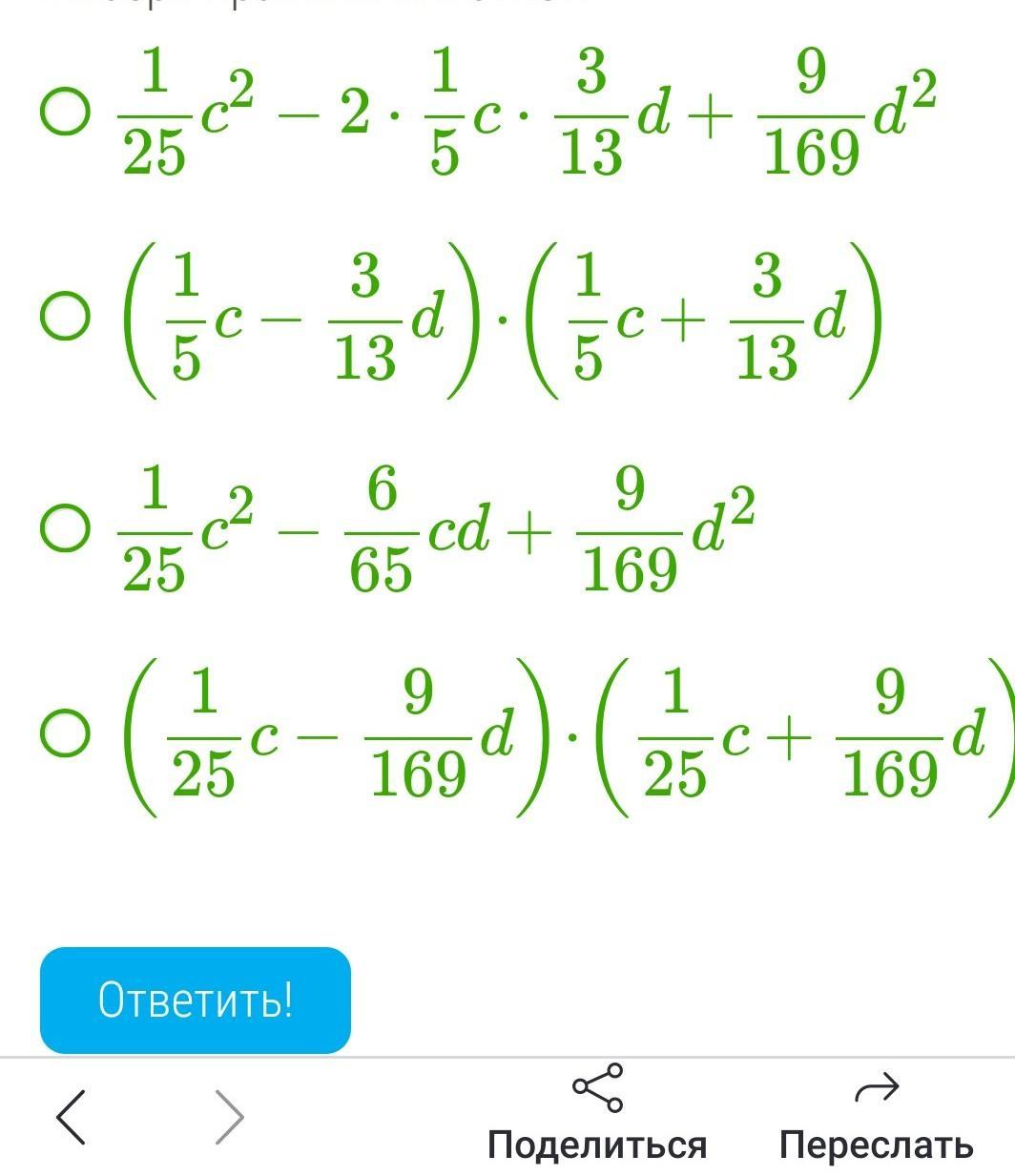 Объяснение: (1/25)c²- (9/169)d²= ((1/5)c)²-((3/13)d)²=