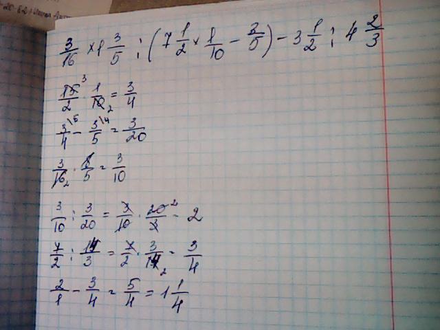 найдите значения выражения 3 дробь 16 умножить на 1 целую 3 дробь 5 разделить на скобку 7 целых 1 дробь 2 умножить на 1 дробь 10 минус 3 дробь 5 скобка закрывается минус 3 целых 1 дробь 2 разделить на 4 целых 2 дробь 3