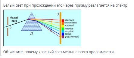 Луч красного цвета преломляется меньше из-за того, что красный свет имеет в веществе наибольшую скорость