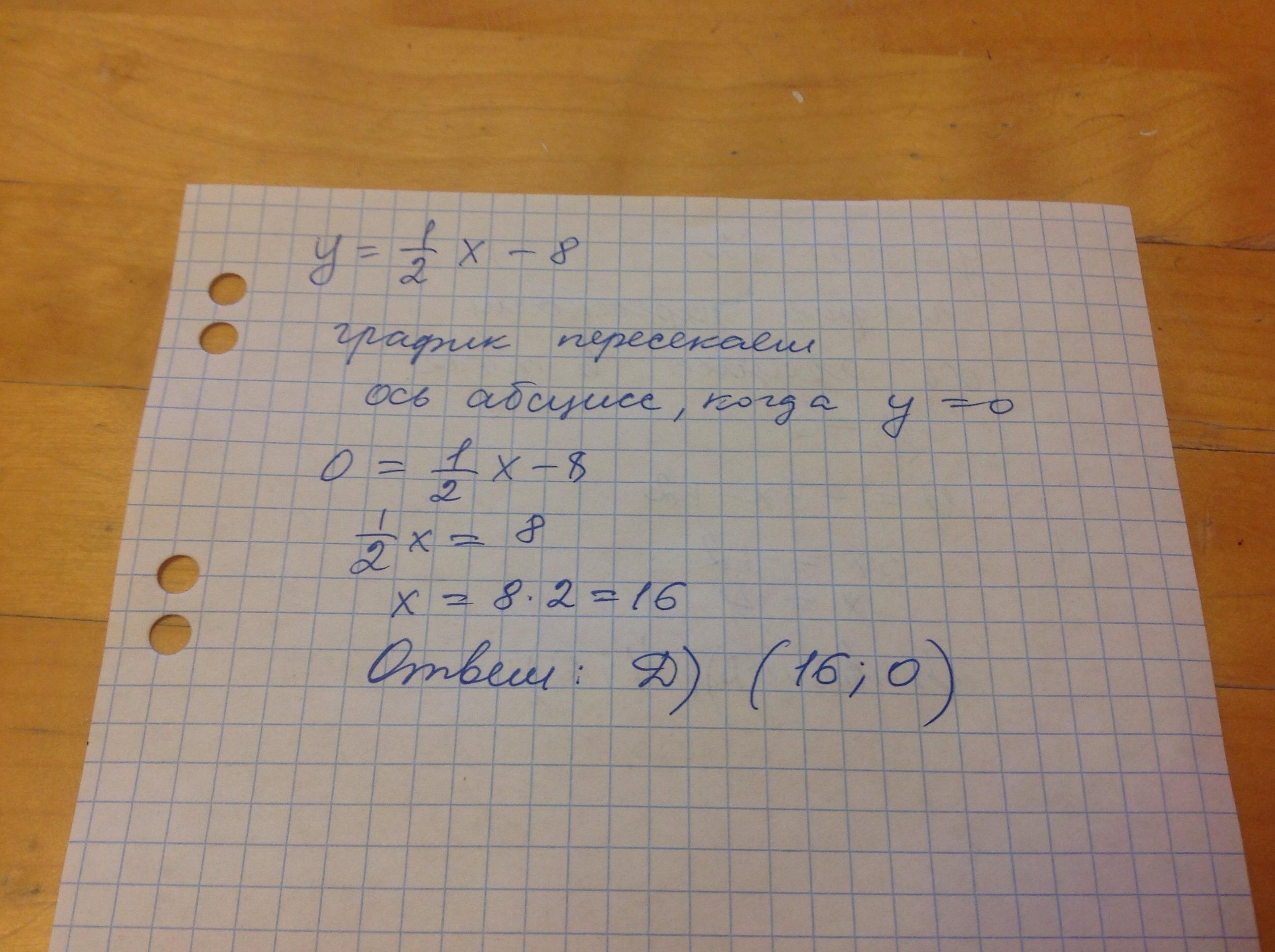 . Найдите координаты точки пересечения функции y=1/2x-8 с осью абсцисс: