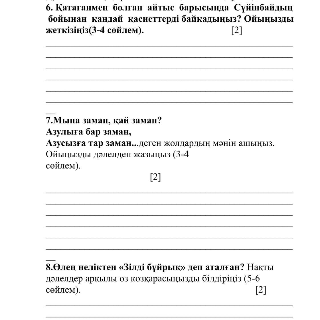 7)Бұл жерде автор заманның жаман жаққа айналып жатқанын түсінді. "Азулыға бар заман" дегеніміз, адамдар ақша туралы ғана ойлап, бəрін ұмытқанын білдіреді. Ал "азусызға тар заман"-жақсы адамдар аз қалды дегеніміз. Бұрында қазақтар өзінің малын беріп, тамақ, киім сатып алатын. Қазақ халқы өте бауырлы болған. Бірақ басқа елдерден келген адамдар ақшаны ойлап тапты. Енді, қазақтар сол туралы ғана ойлай бастаған. Өзінің тату-тәтті өмірін ұмытып, ақшаны ғана ойлады.(Біздің апайымыз бəрін айтып берген)