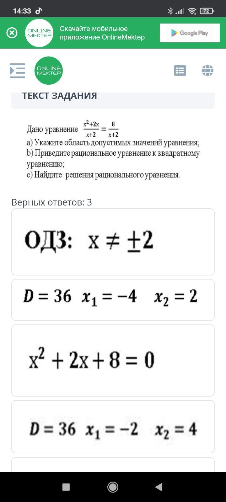 Дано уравнение a) Укажите область допустимых значений уравнения; b) Приведите рациональное уравнение к квадратному уравнению; c) Найдите решения рационального уравнения.