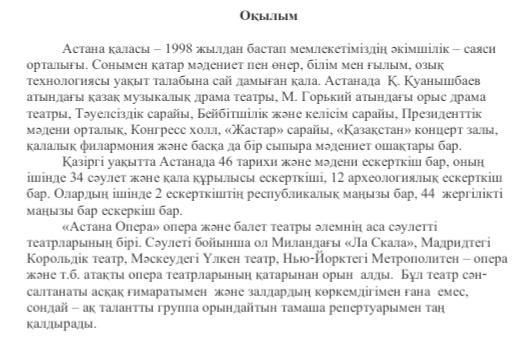 4. Мәтіннің негізгі ойын анықтаңыз.А) Астана қаласы туралыВ) Астананың сәулетті жерлері туралыС) Астананың танымал көшелері туралыД) Астана мәдениет пен өнер орд