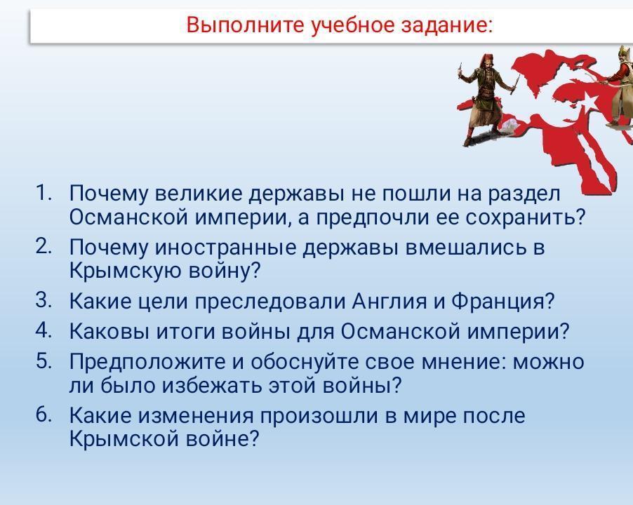 6 некоторые страны Как Англия и Франция позже станут большими колониальными державами. после смерти Николая i в русской империи Александр (не помню какой именно вроде 2 но точно не скажу) начнёт реформировать армию улучшать экономику в стране а Османская империя начнет понемногу распадаться.