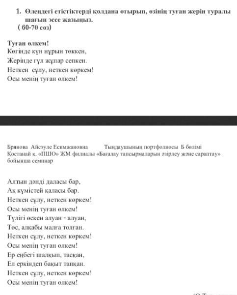 Менің туған жерім өзім үшін ыстық.Туған жерімнен ешқашан жыраққа кете алмаспын.Ауасы,Суы өте керемет.Туған жерімнің табиғаты өте сұлу,көрікті көрсең көсің тойматын керемет салқын ауасы дертке ұшыраған адамды бірден жазылтады.Әр адамға өз өлкесі жақын болып кетеді.Әр ақын өз туған жері үшін өлеңдер жазып қалдырғаны да бекер емес.Біз жерімізді барынша қастерлеуіміз керек.Өйткені бұл бізің өлкеміз ТУҒАН ЖЕРІМІЗ.