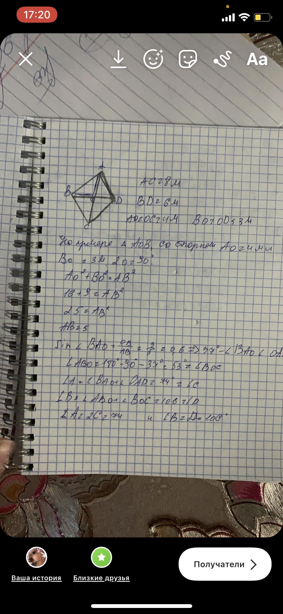 Найдите углы ромба, диагонали которого равны 8 см и 6 см