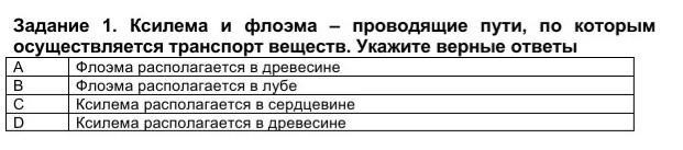Задание 1. Ксилема и флоэма – проводящие пути, по которым осуществляется транспорт веществ. Укажите верные ответы