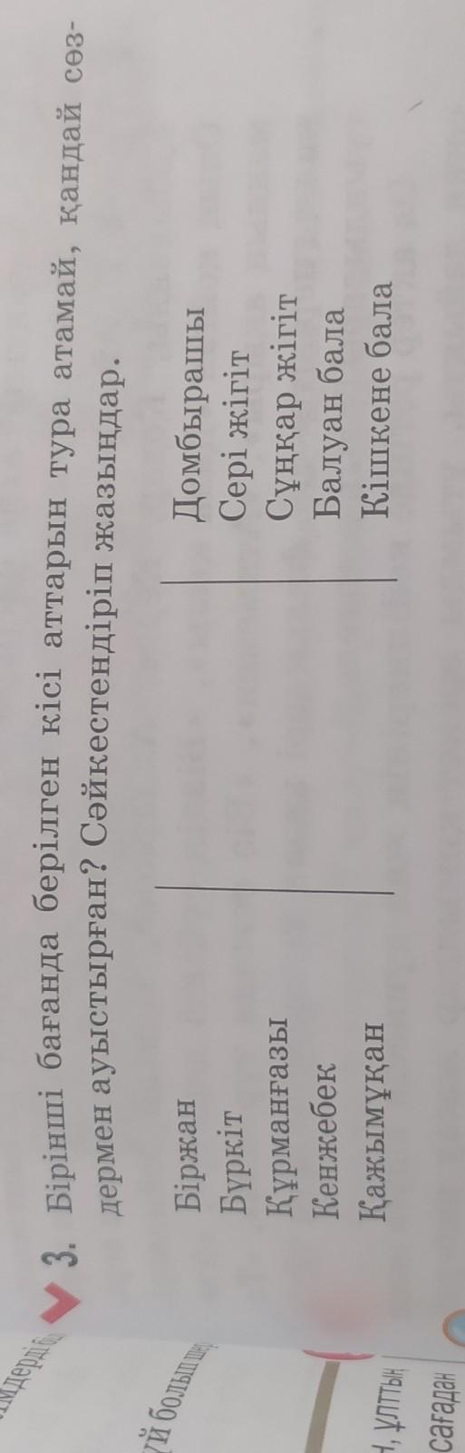 Біржан-сері жігіт, бүркіт-сұңқар жігіт, Құрманғазы-домбырашы, Кенжебек-кішкене бала, Қажымұқан-Балуан бала