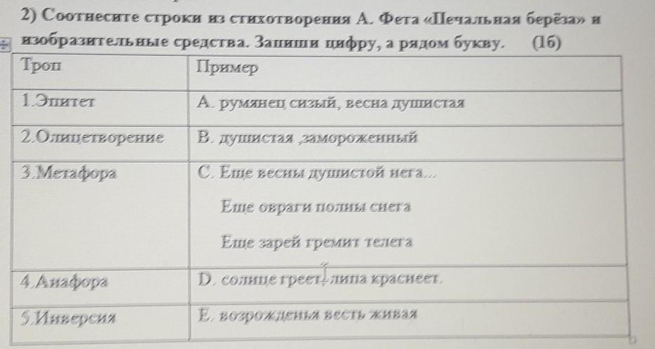 2) Соотнесите строкн на стихотворення А. Фета Печальная берёза» н