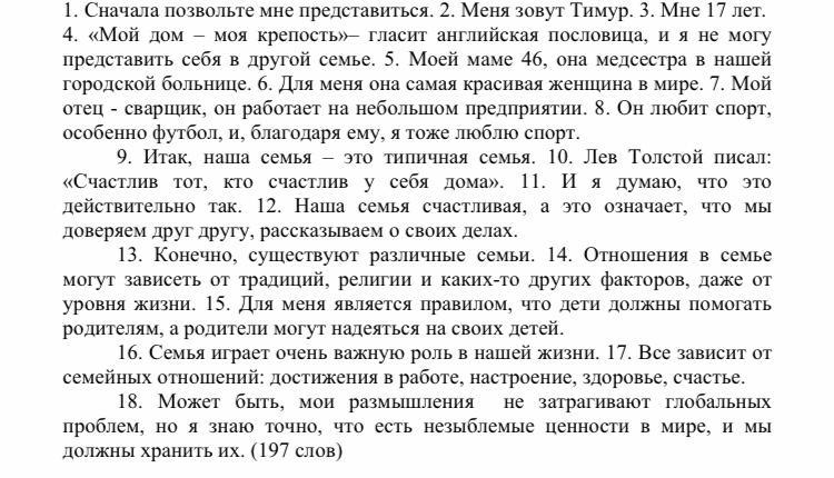 1. Сначала позвольте мне представиться. 2. Меня зовут Тимур. 3. Мне 17 лет. 4. «Мой дом – моя крепость»– гласит английская пословица, и я не могу представить себя в другой семье. 5. Моей маме 46, она медсестра в нашей городской больнице. 6. Для меня она самая красивая женщина в мире. 7. Мой отец - сварщик, он работает на небольшом предприятии. 8. Он любит спорт, особенно футбол, и, благодаря ему, я тоже люблю спорт.