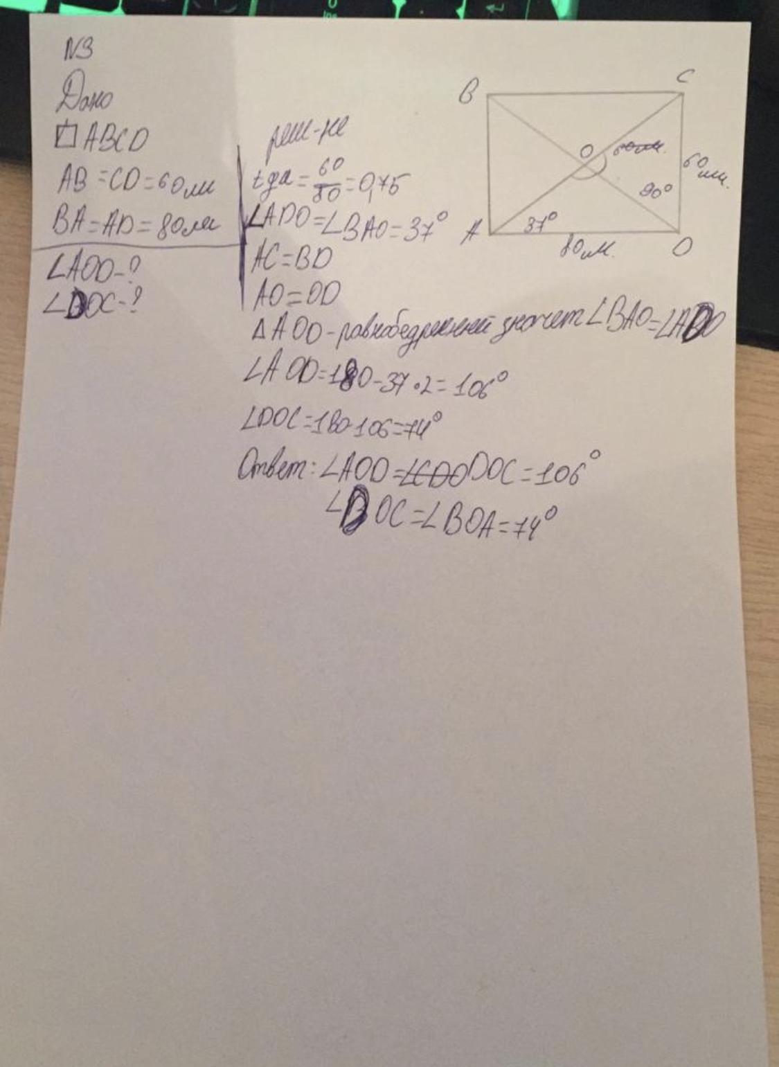 Стороны прямоугольника равны 60см и 80см. Найдите с точностью до 1° острый угол между его диагоналями.