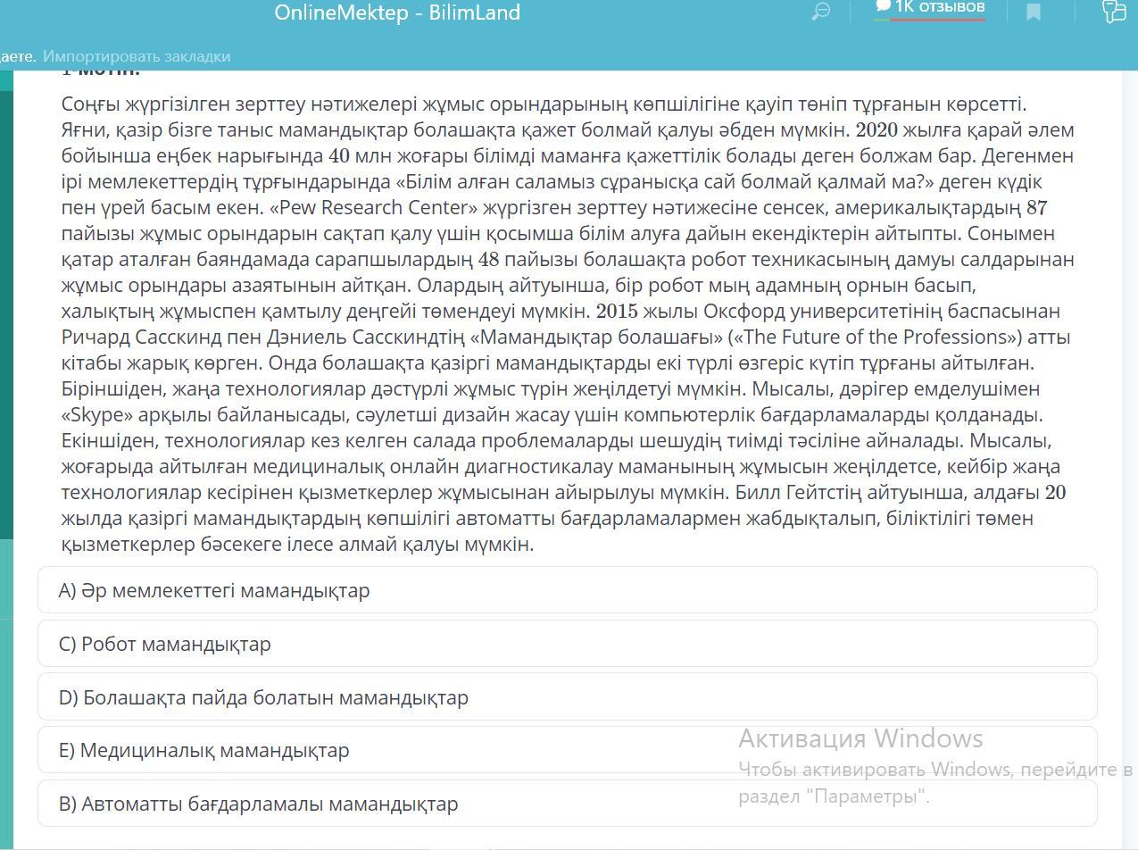 1.Бірінші мәтін мазмұнына лайықты тақырып. А)Әр мемлекеттегі мамандықтар.В)Автоматты бағдарламалы мамандықтар.С)Робот мамандықтар.D)Болашақта пайда болатын мамандықтар.Е)медициналық мамандықтар.