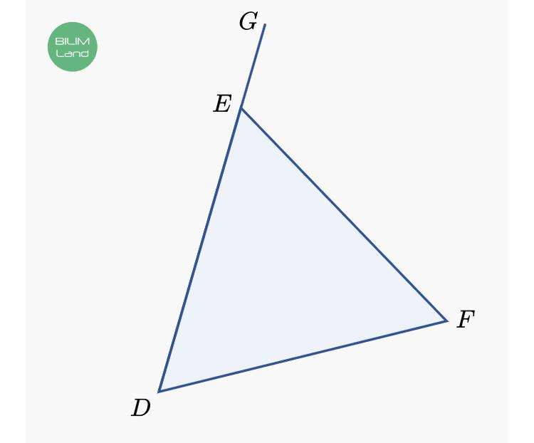 На рисунке сторона DE равностороннего треугольника DEF удлинена, а угол GEF в 2 раза больше угла DEF. Найдите углы треугольника EDF. ∠DEF = °. ∠EDF = °. ∠DFE = °.