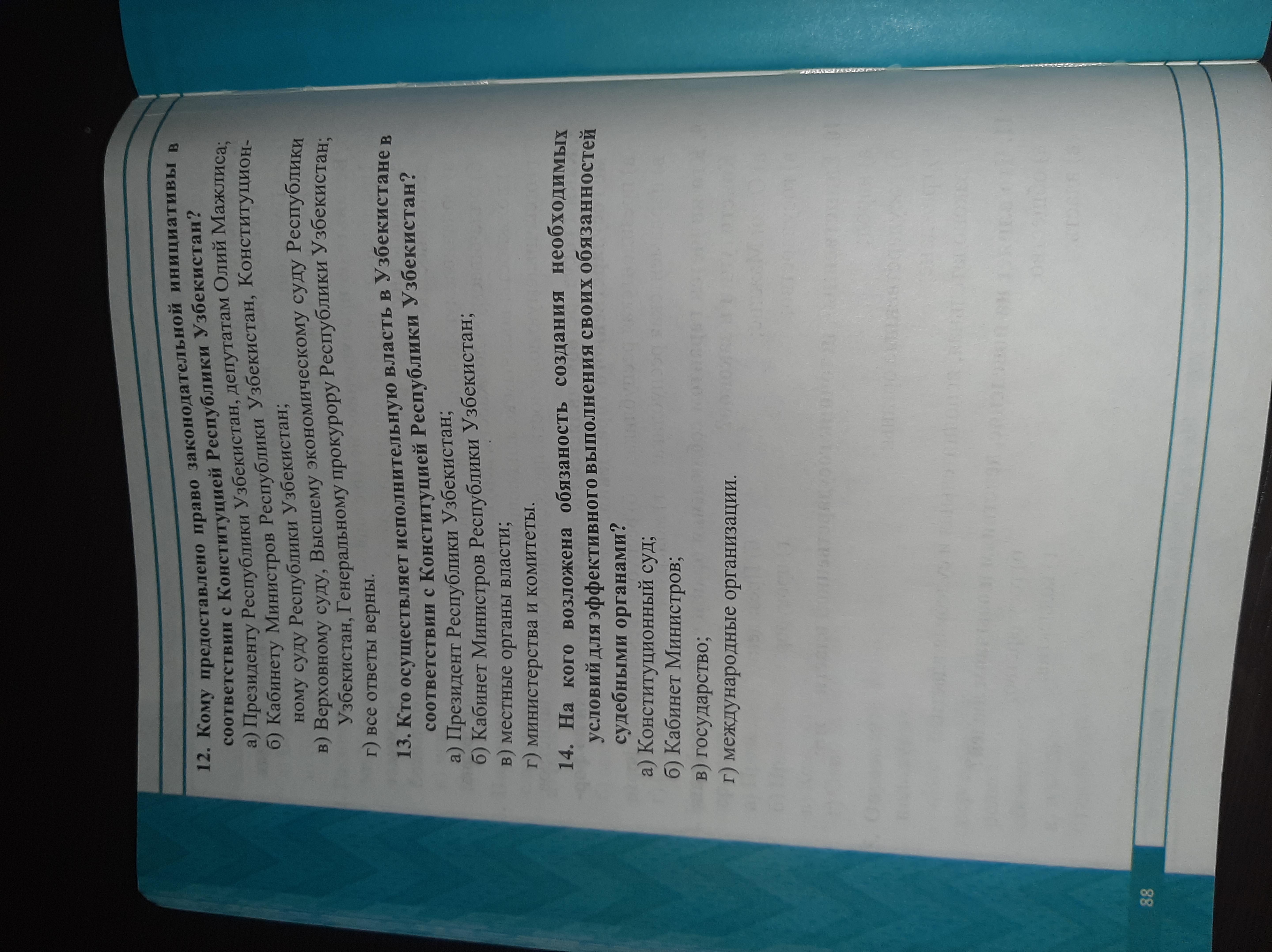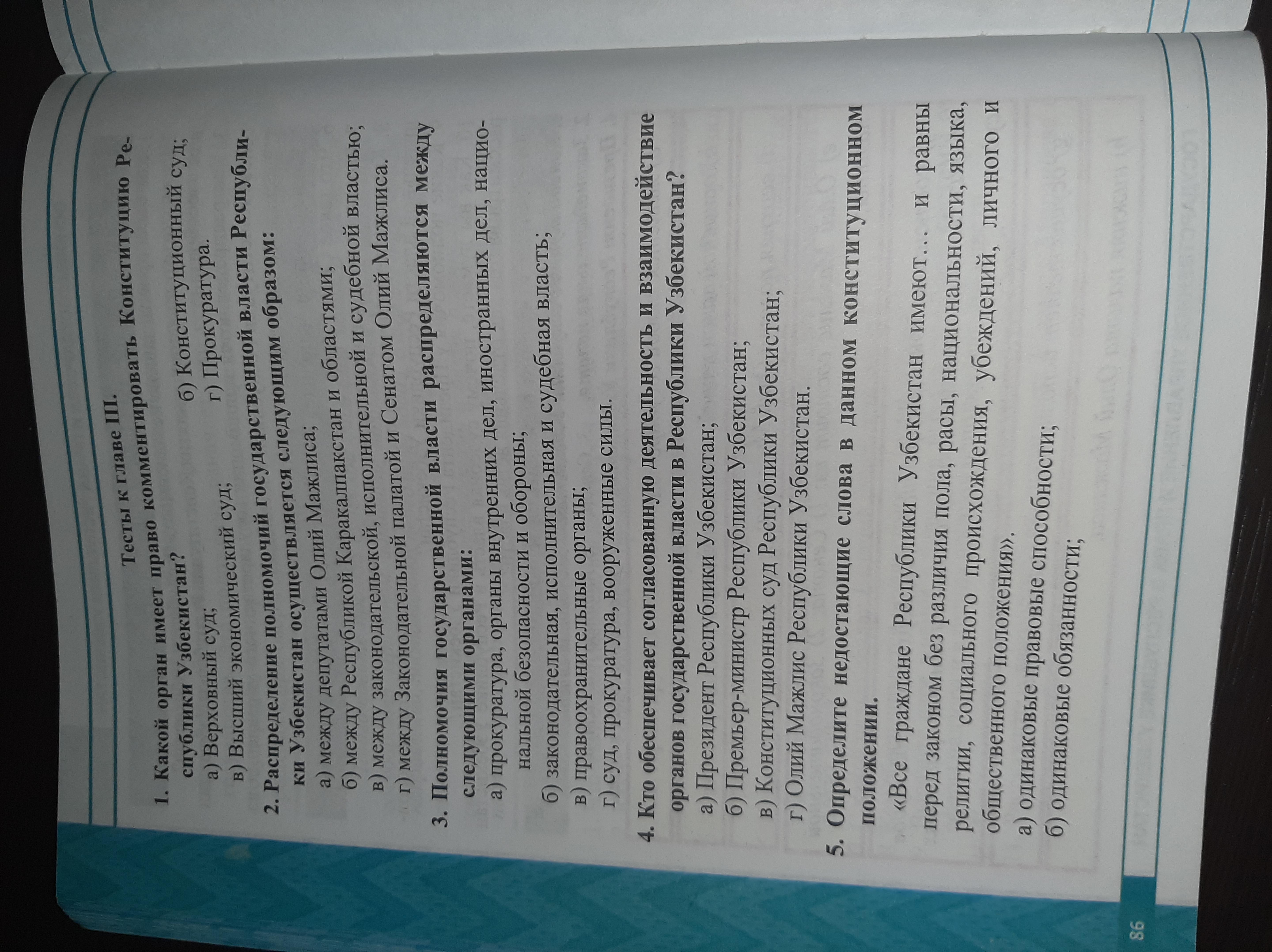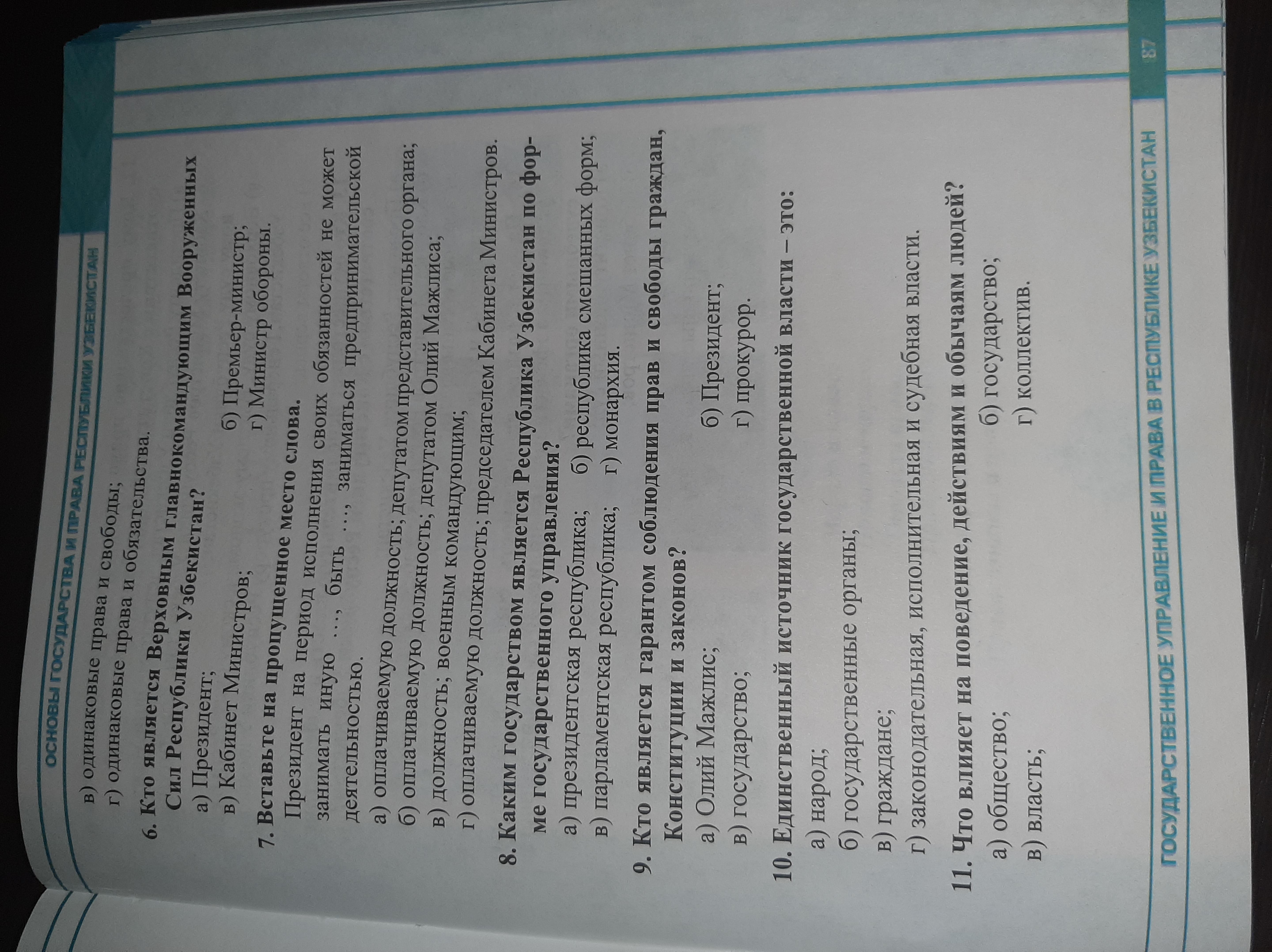 Здраствуйте, добрые люди! Помогите пожалуйста решить тесты по "Основы государства и права республики Узбекистан". Учебник 8 класса, ниже прикрепил фото с тестами. Заранее огромное спасибо