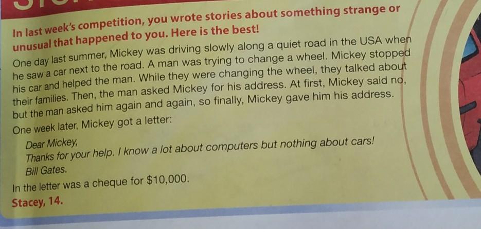 4. At the beginning of the story, Mickey saw a man who couldn't change a wheel, and Mickey helped the man. In the Middle of the story, it says that Mickey has already helped the man, and the man asked for his address, Mickey refused, but then still said. At the end of the story, the man sent a letter to Mickey, in which he said that he was bill gates, and in the letter lay 10 thousand dollars for help with the car.