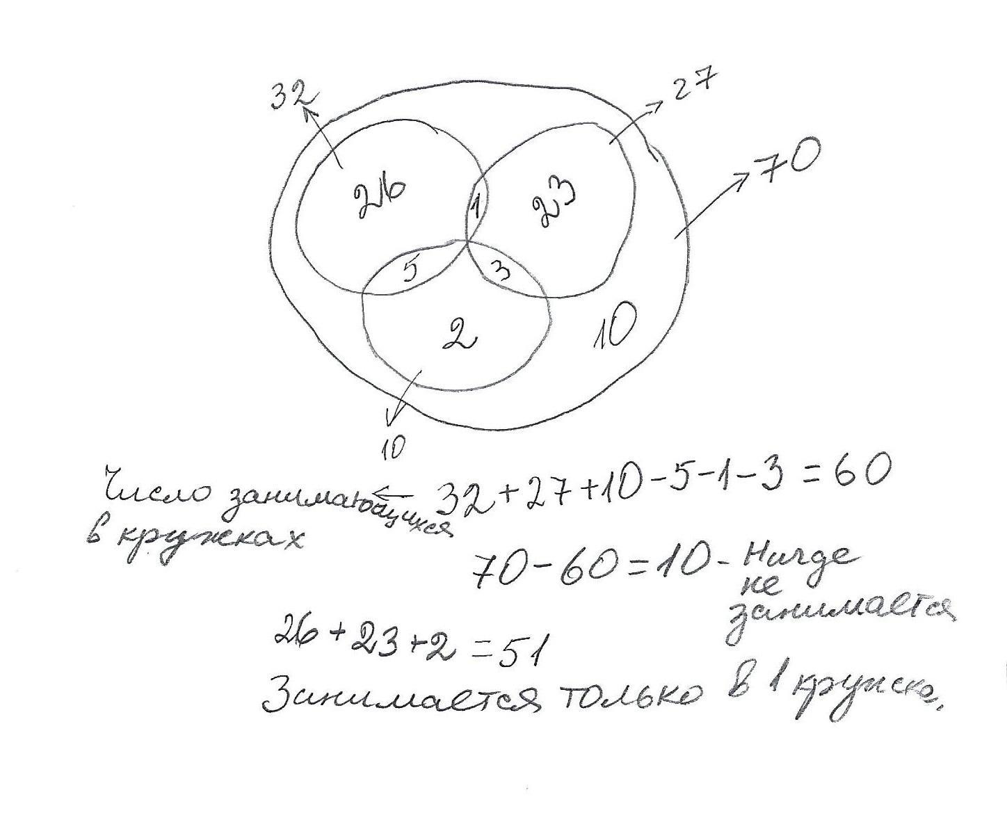 Всего 70 учеников. Значит 1 ученик нигде не занимается,а все остальные занимаются только в одном кружке.-это один из вариантов.