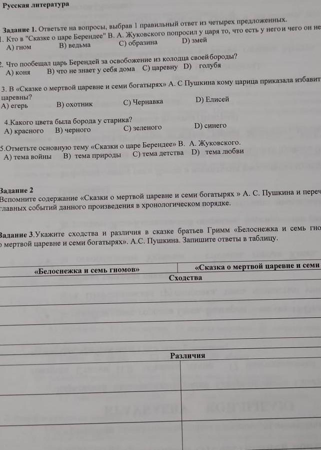 .Задание 1. Ответьте на вопросы, выбрав 1 правильный ответ из четырех предложенных. 1. Кто в "Сказке о царе Берендее" В. А. Жуковского попросил у царя то, что есть у него и чего он не знает А) гном В) ведьма C) образина D) змей 2. Что пообещал царь Берендей за освобожение из колодца своей бороды? А) коня В) что не знает у себя дома С) царевну D) голубя 3. В «Сказке о мертвой царевне и семи богатырях» А. С Пушкина кому царица приказала избавиться от царевны? A) егерь В) охотник 4. Какого цвета была А) красного C) Чернавка борода у старика? В) черного С) зеленого D) Елисей D) синего 5.Отметьте основную тему «Сказки о царе Берендее» В. А. Жуковского. A) тема войны В) тема природы С) тема детства D) тема любви Задание 2 Вспомните содержание «Сказки о мертвой царевне и семи богатырях » А. С. Пушкина и перечислите главных событий данного произведения в хронологическом порядке. пять Задание 3. Укажите сходства и различия в сказке братьев Гримм «Белоснежка и семь гномов» и «Сказке о мертвой царевне и семи богатырях». А.С. Пушкина. Запишите ответы в таблицу. «Белоснежка и семь гномов» «Сказка о мертвой царевне и семи богатырях» Сходства Различия