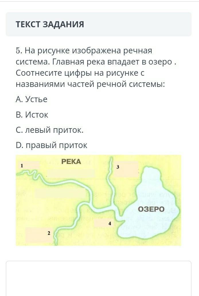 5. На рисунке изображена речная система. Главная река впадает озеро. соотнесите цифры на