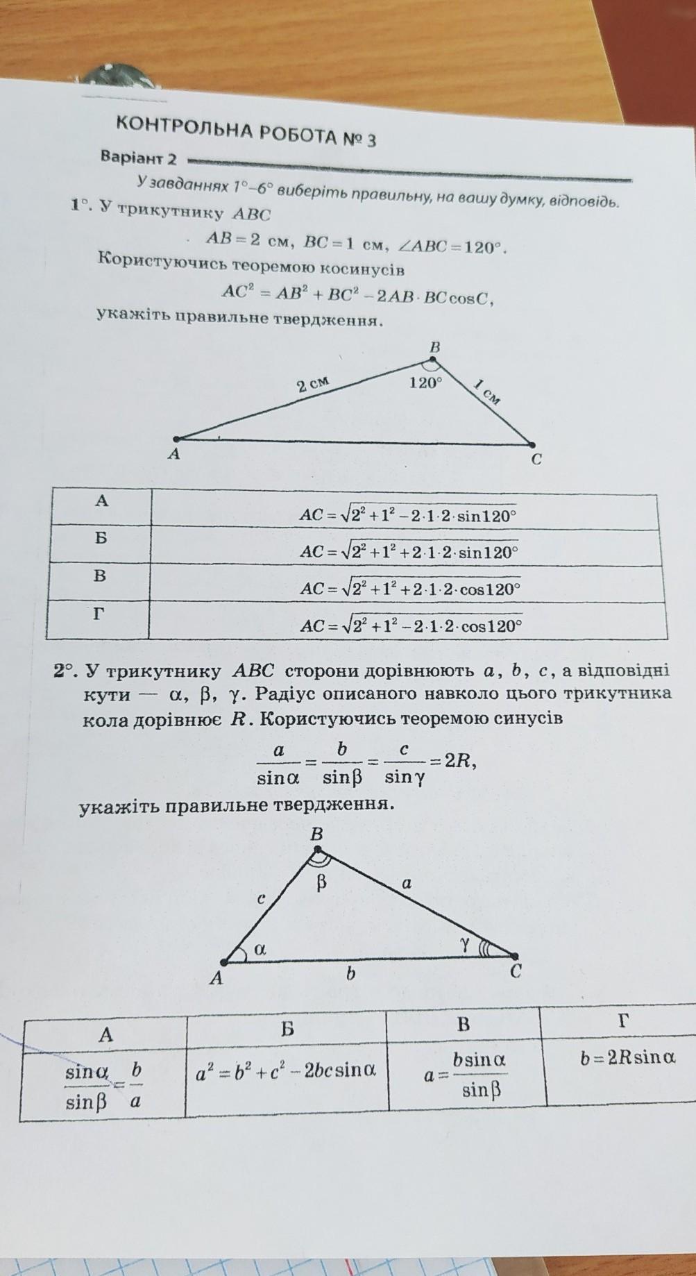 1) Квадрат будь-якої сторони трикутника дорівнює сумі квадратів двох інших його сторін без подвоєного добутку цих сторін на косинус кута між ними.
