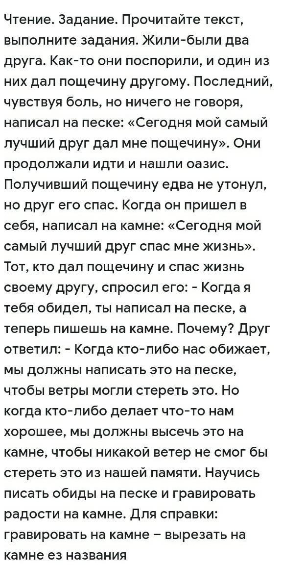 Дружили два друга .Один раз они поспорили, и один другому дал пощёчину.Друг,которому дали пощёчину написал о своей обиде на песке.В следующий раз этого друга спас его друг.И в этот раз он это написал на камне,чтобы не забыть это никогда.Этот рассказ говорит нам о том ,что нужно ценить друзей и уметь прощать.
