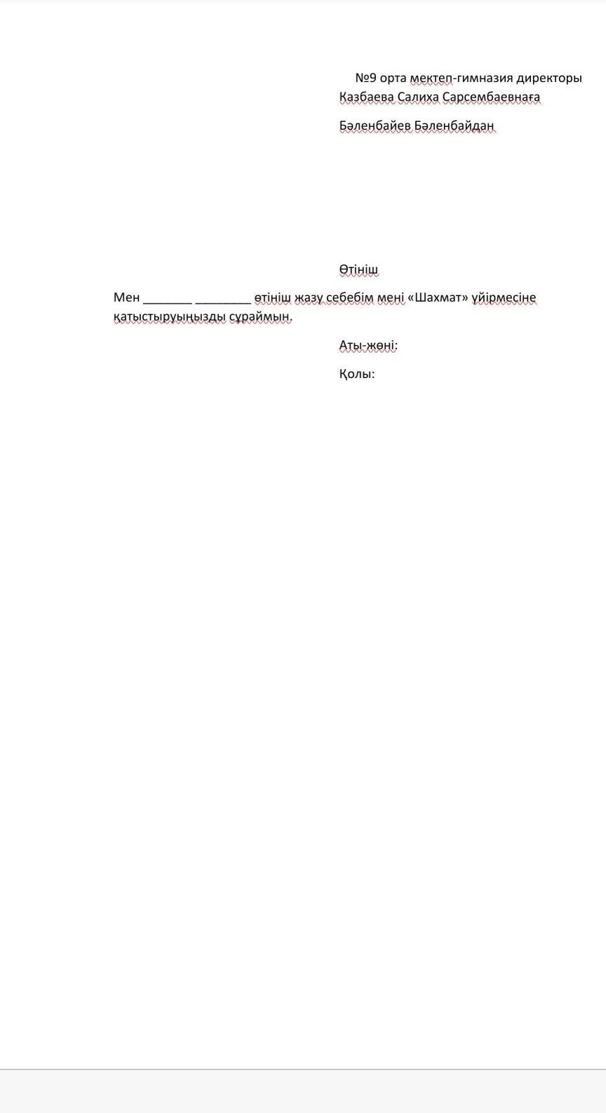 Өтініш жазу. “Шахмат" үйірмесіне қатысуға №9
