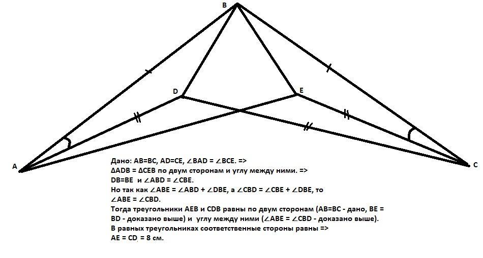 на рисунки 32 ab=bc, ad=ce, угол bad=угол bce. найти длину отрезка ae , если cd=8cm.