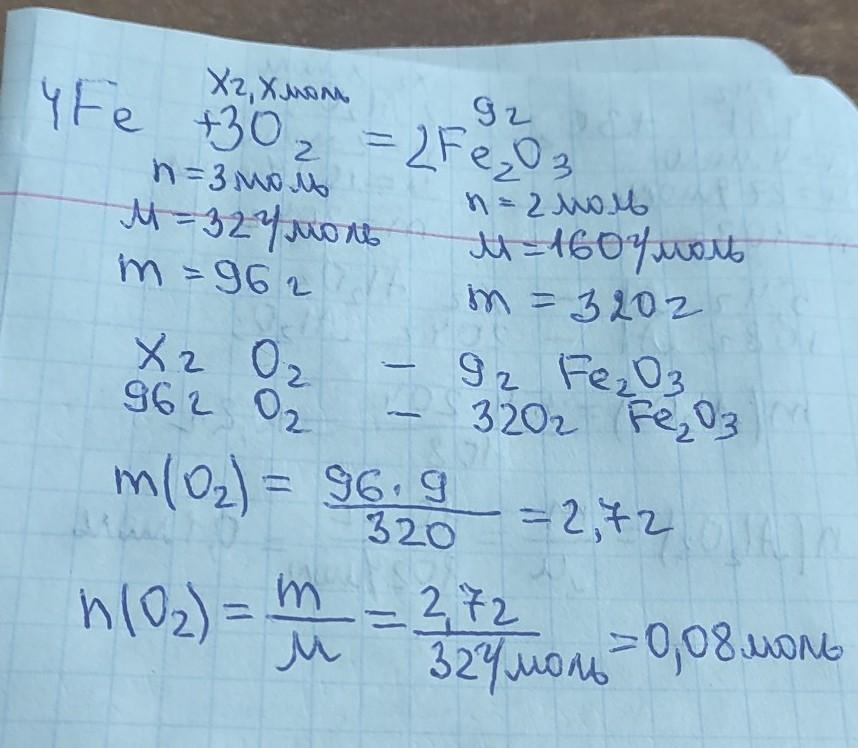Вычислите массу и количество кислорода прореагировавшего с железом если образовалось 9г оксида железа (|||)