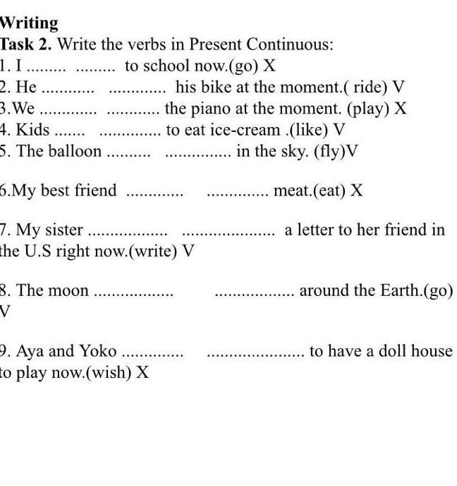 I am going to school now. He is riding his bike at the moment. We are playing the piano at the moment. Kids like to eat ice-cream. The balloon is flying in the sky. My best friend is eating meat. My sister is writing a letter to her friend in the U.S right now. The moon is going around the Earth. Aya and Yoko wish to have a doll house to play now.