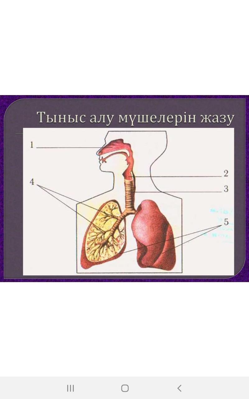 1.көмей (көмекей), 2.бронхы, 3. өкпе 4.мұрын 5.кеңірдек