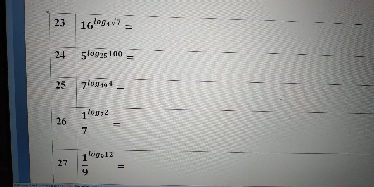 23) (4^2)^log(4)V7=(4^log(4)V7)^2=(V7)^2=7