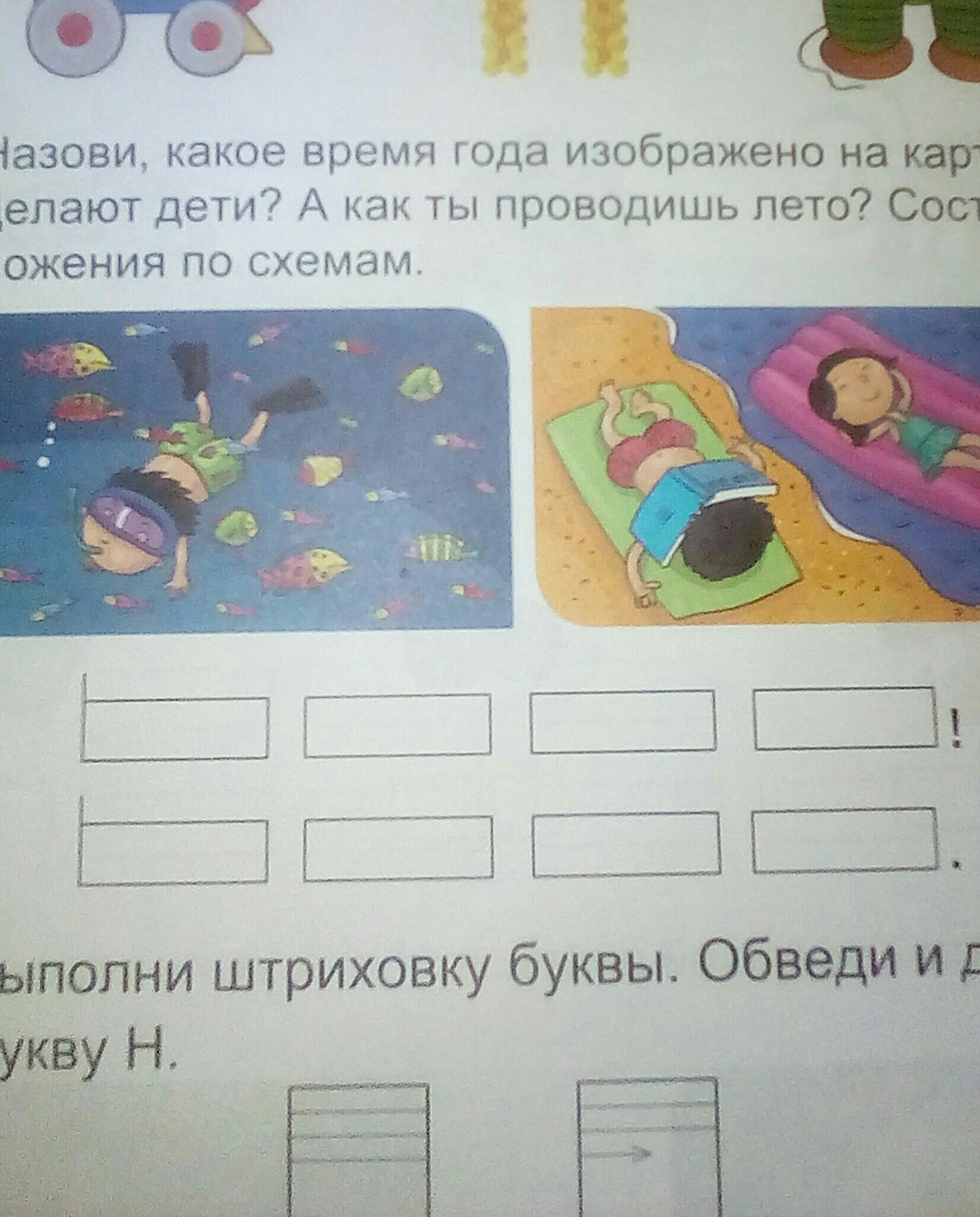 ого<br />я<br />5. Назови, какое время года изображено на картинке. Что<br />делают дети? А как ты проводишь лето? Составь пред-<br />ложения по схемам.