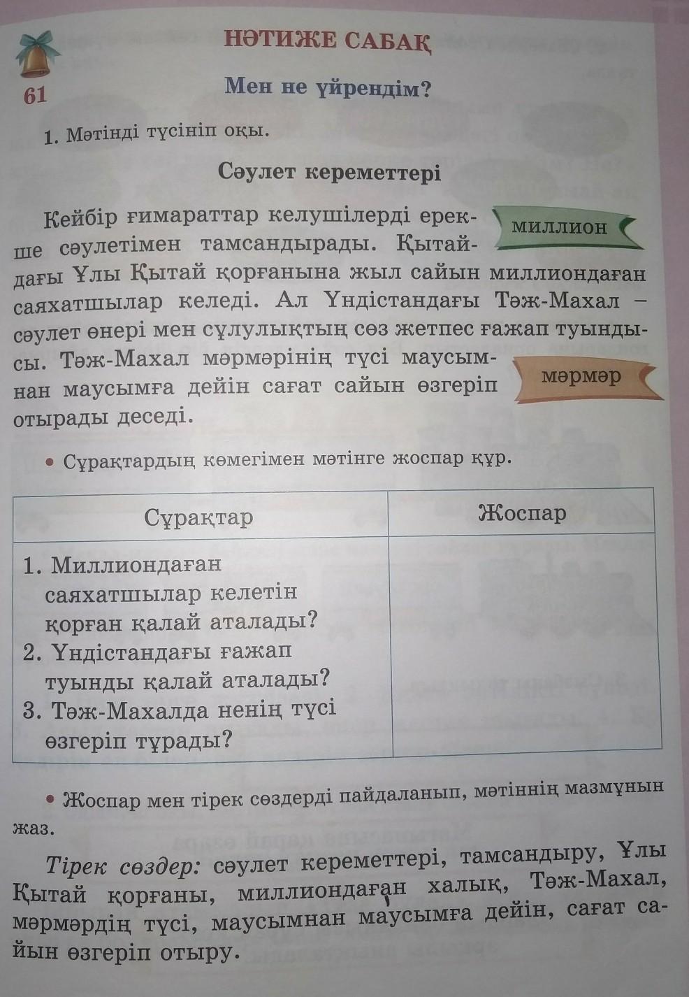 • Сұрақтардың көмегімен мәтінге жоспар құр.