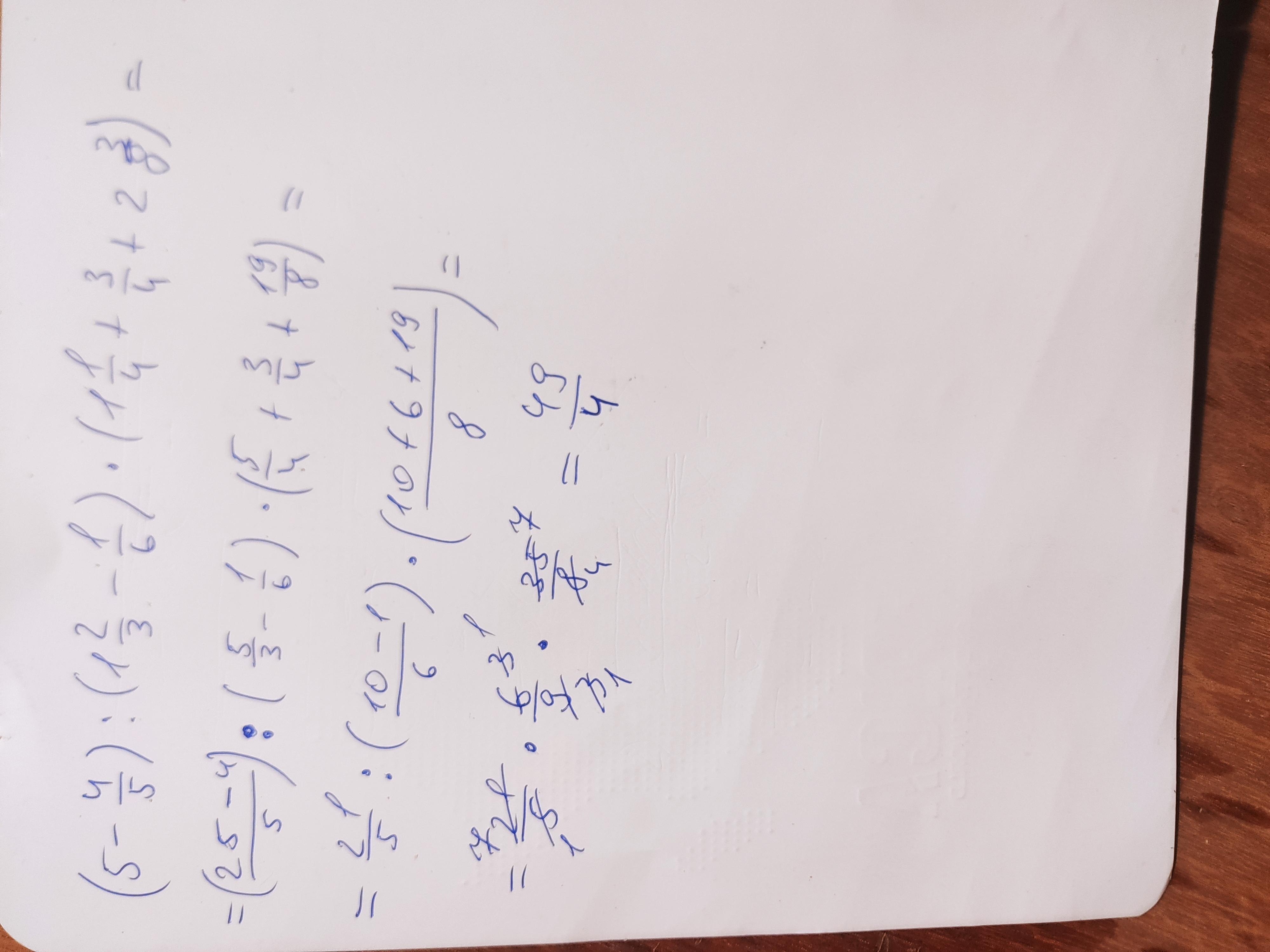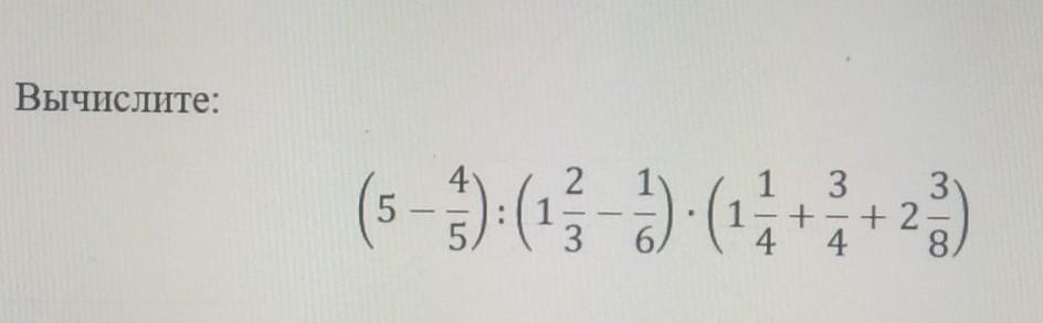 вычислите (5 - 4/5) : (1 2/3 - 1/6) * (1 1/4 + 3/4 + 2 3/8)=​