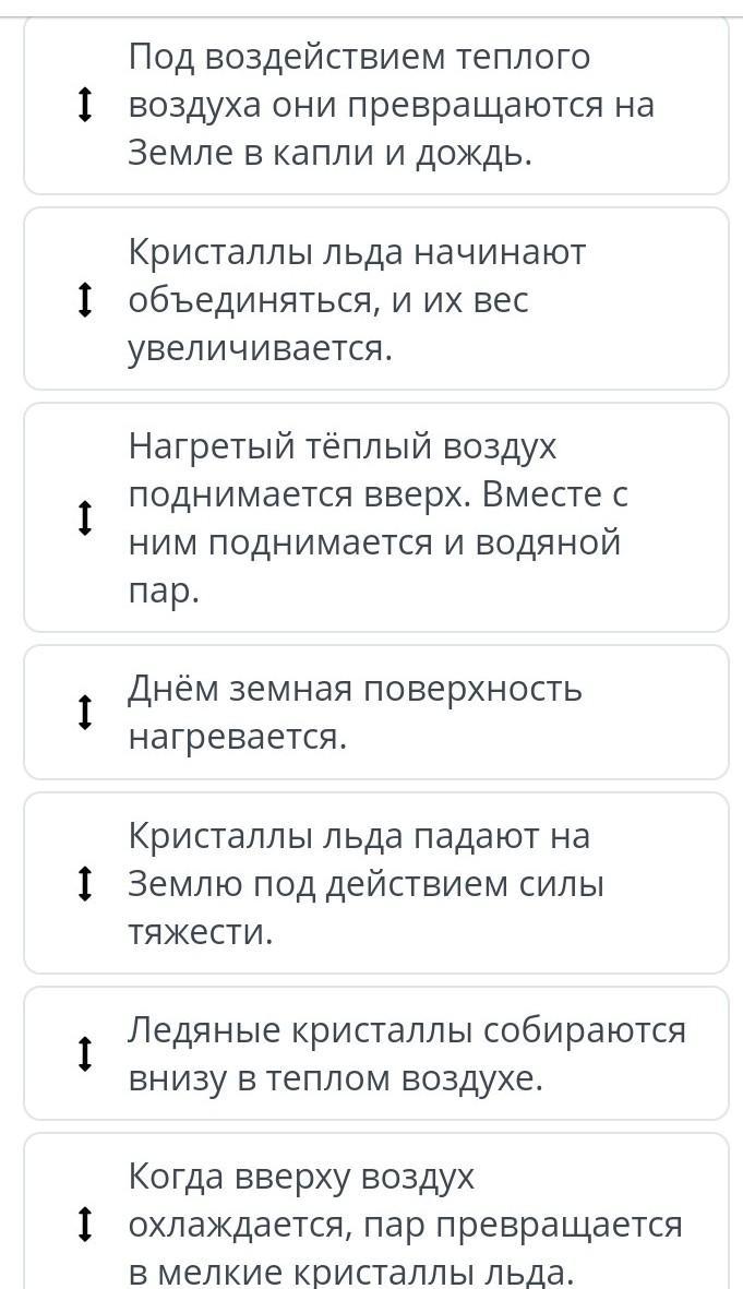прочитай предложения.Размести процесс образования дождя сверху вниз перемещая карточки