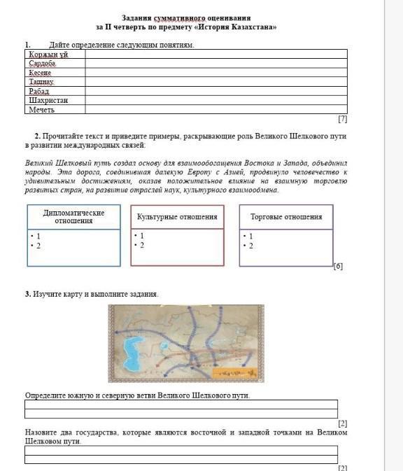 Ответ: 1-ветка: Южная (через Южный Казахстан и Жетису ) 2-ветка:Северная (Центральный и Западный Казахстан) 1.Восточная точка:Китай 2.Западная точка: ВизантияДипломатические отношения. (это 3)