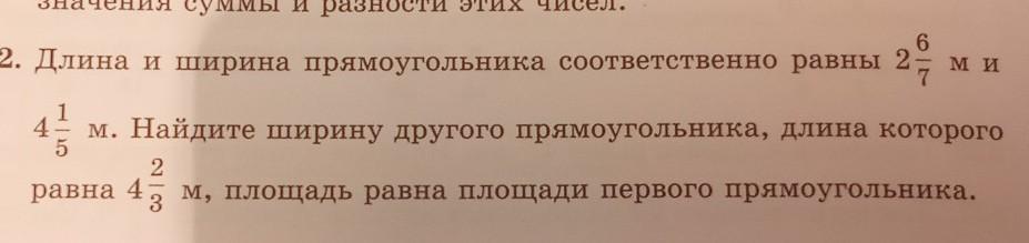 S = 2 6/7 • 4 1/5 = 20/7 • 21/5 = 12 м2 площадь первого прямоугольника
