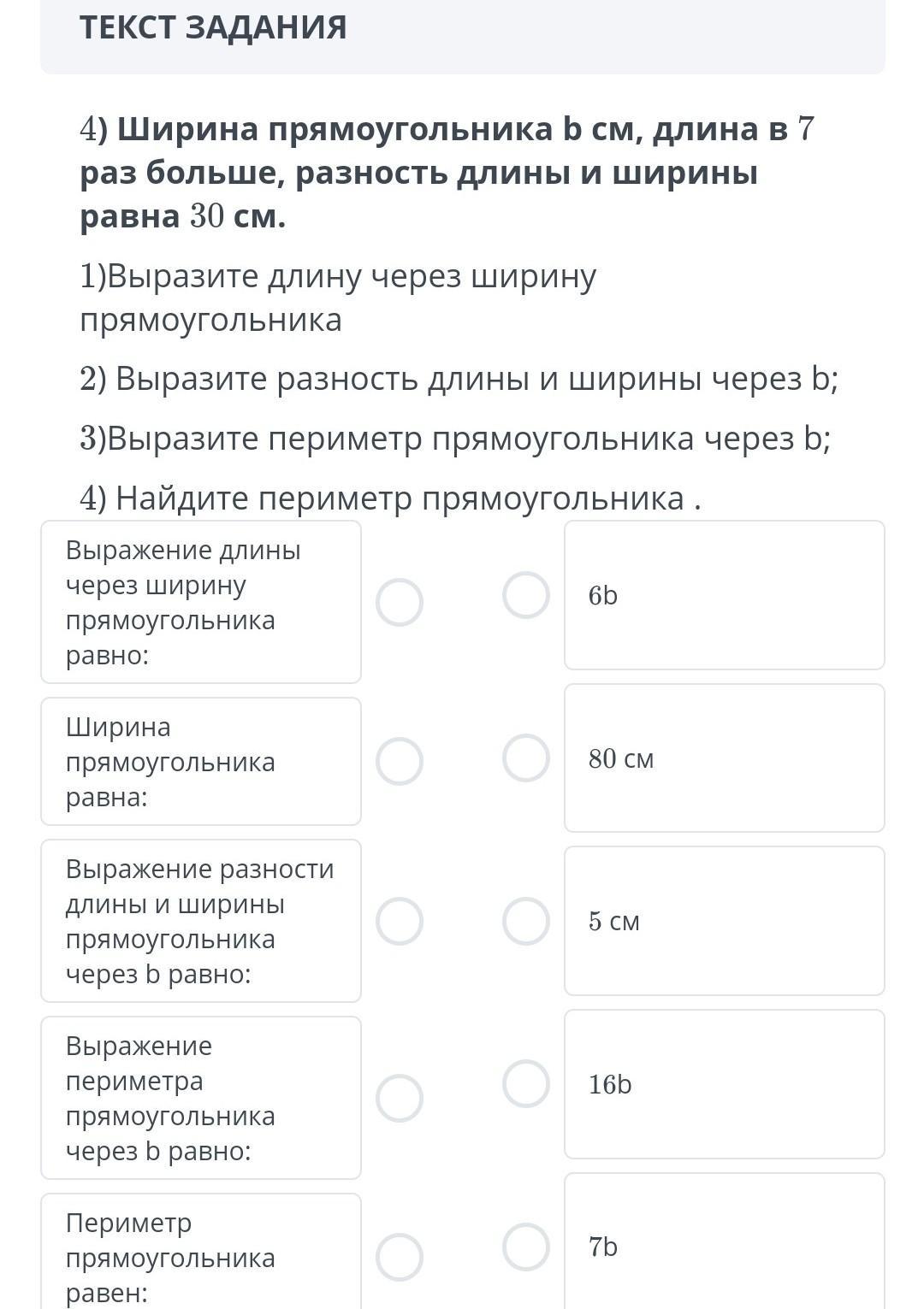 4) Найдите периметр прямоугольника . Выражение длины через ширину 6b прямоугольника равно: